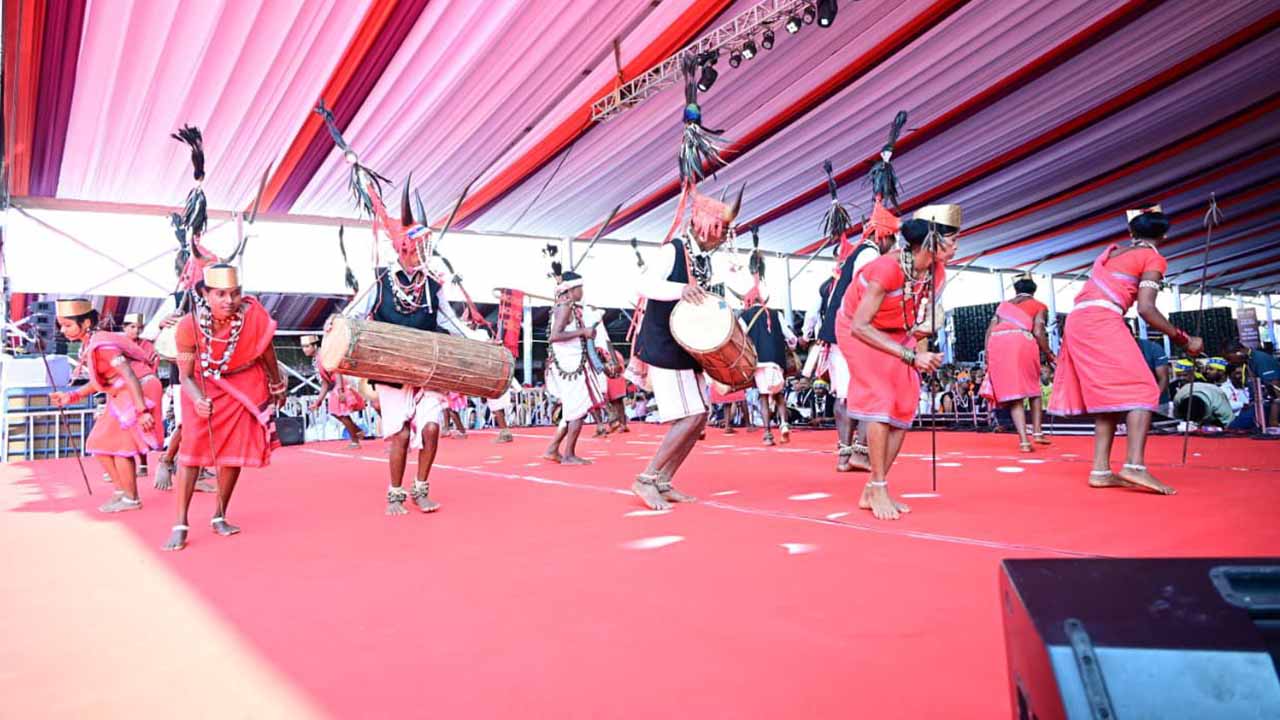 बास्तानार के युवाओं द्वारा प्रस्तुत यह नृत्य केवल एक सांस्कृतिक प्रदर्शन भर नहीं था, बल्कि ‘दंडामी माड़िया’ (बाइसन हॉर्न माड़िया) जनजाति की परंपराओं, जीवन-दर्शन और सांस्कृतिक चेतना का एक जीवंत दस्तावेज था। जैसे ही नर्तक दल मंच पर उतरा, उनकी विशिष्ट वेशभूषा ने उपस्थित जनसमूह का ध्यान सहज ही अपनी ओर आकर्षित कर लिया। पुरुष नर्तकों के सिर पर सजे गौर के सींगों वाले मुकुट, जिन्हें कौड़ियों और मोरपंखों से अलंकृत किया गया था, बस्तर की वन्य संस्कृति तथा गौर पशु के प्रति आदिवासी समाज के गहरे सम्मान और श्रद्धा को प्रतीकात्मक रूप से अभिव्यक्त कर रहे थे। वहीं पारंपरिक साड़ियों और आभूषणों से सुसज्जित महिला नर्तकियों ने जब अपने हाथों में थमी ‘तिरूडुडी’ (लोहे की छड़ी) को भूमि पर पटकते हुए ताल दी, तो एक अद्भुत, गूंजती और लयबद्ध ध्वनि ने वातावरण को मंत्रमुग्ध कर दिया।